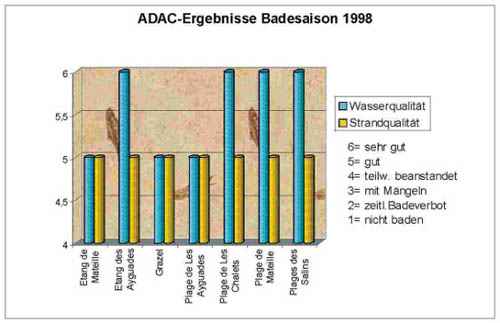 Auch die Wassertemperaturen sind - oft bis zum Oktober angenehm zum Baden. Das Wasser hat eine ausgezeichnete Qualität, siehe Tabelle vom ADAC