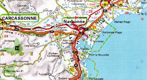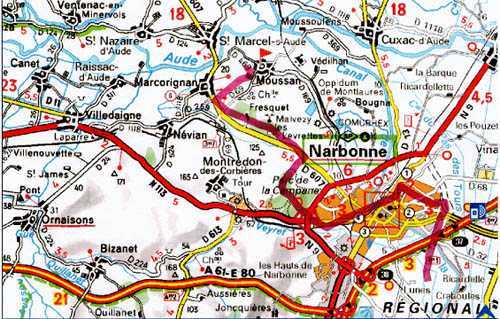Und der Nahbereich zwischen Moussan und Narbonne auf der Karte: